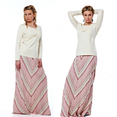 Прекрасное качество ткани. Ткань не растягивается, не идет катышками. Верхняя часть выглядит, как надетая поверх нижней кофточка-болеро. Отлично скрывает живот и спину, подойдет также для беременного животика. Смотрится прекрасно на любой фигуре! При этом практична, не требует глажки и частой стирки. Секрет кормления - болеро (верхний слой при кормлении отодвигается вниз или вверх). Верхний слой над грудью перекручен, образуя посередине изящные складки. Рукава длинные.