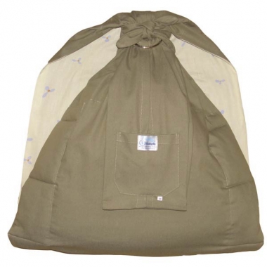 В данной модели конец полотна слинга зашит и образует внутренний карман. Снаружи имеется ещё один нашивной карман. Внешняя ткань - джинс (95% хлопок, 5% лайкра). Внутренняя ткань - однотонный ситец. Такой слинг хорошо иметь как второй слинг для улицы, он больше подходит для ношения в холодное время года или в прохладную погоду или в холодной квартире.