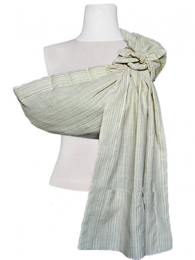 Данный однослойный слинг с кольцами изготовлен из плательной ткани, поэтому красиво смотрится. Имеются синтепоновые бортики и подушка на плечо маме. Кольца закрываются специальным бантом.