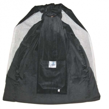 В данной модели конец полотна слинга зашит и образует внутренний карман. Снаружи имеется ещё один нашивной карман. Внешняя ткань - джинс (100% хлопок). Внутренняя ткань - однотонный ситец. Такой слинг хорошо иметь как второй слинг для улицы, он больше подходит для ношения в холодное время года или в прохладную погоду или в холодной квартире.